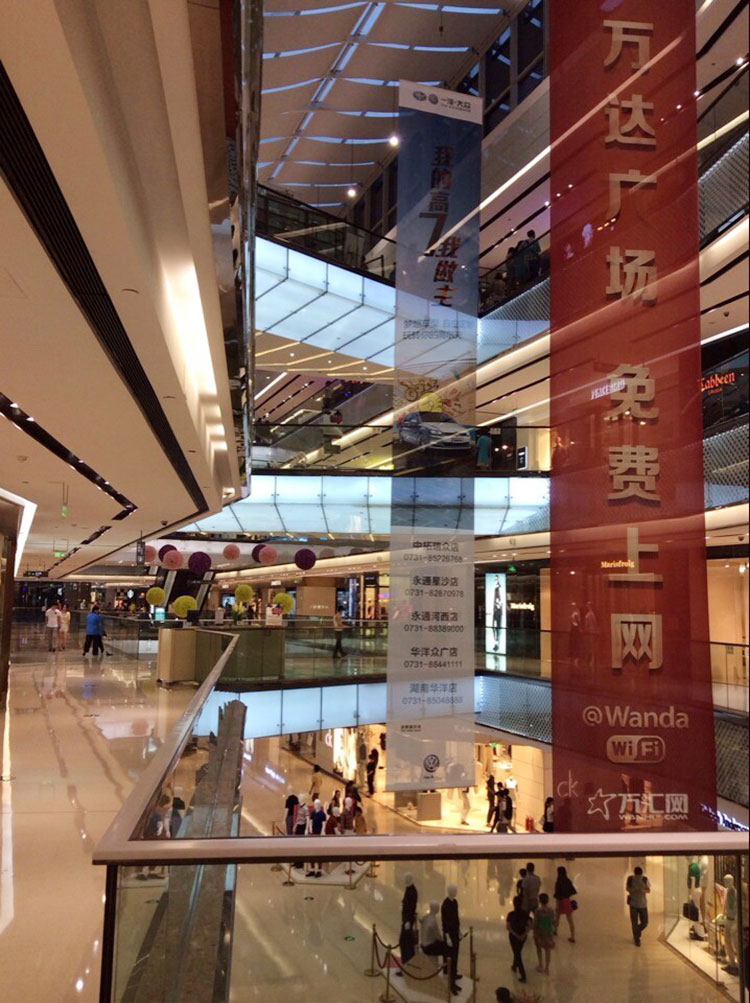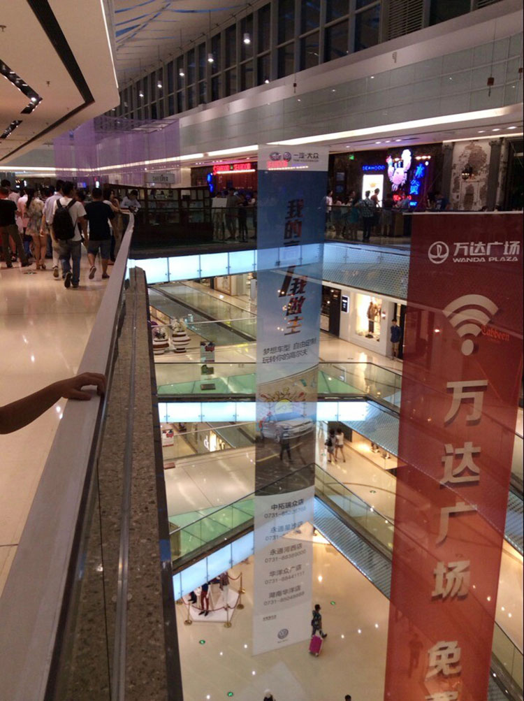 賣場,城市購物綜合體,MALL的中庭廣告吊旗,都是采用雙面布或雙面網格布廣告畫,因為這兩種布平直,不卷邊,噴畫效果好。