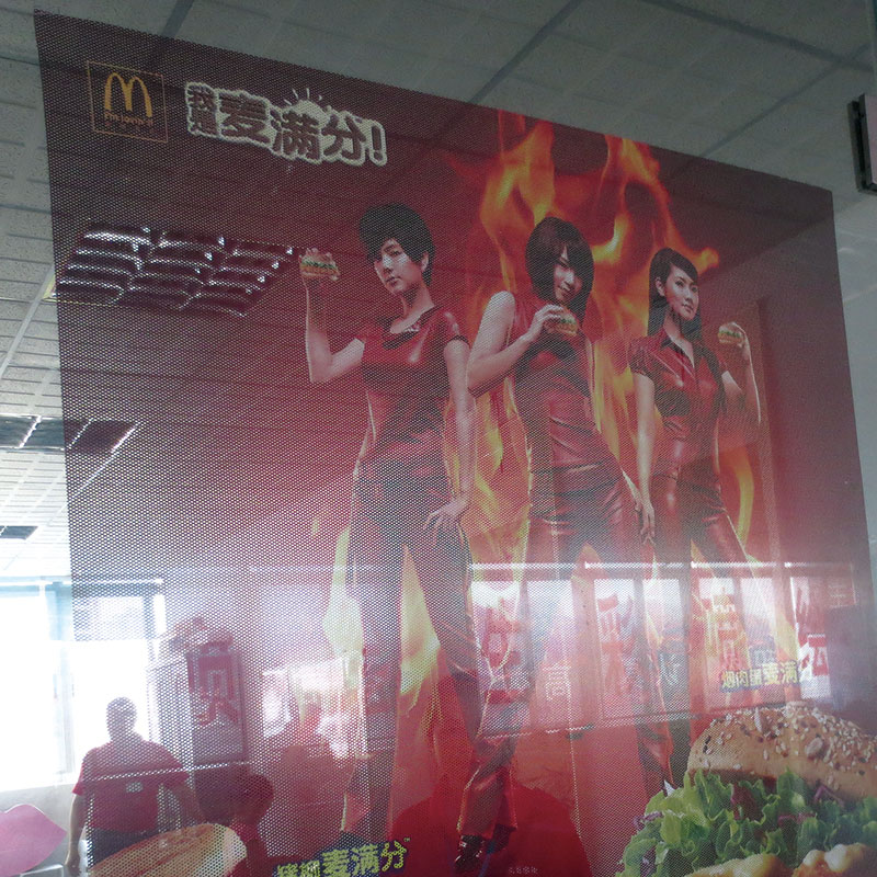 單孔透表面分布了很多圓孔,適合于粘貼在玻璃上,具半透明效果,適用于商場玻璃幕墻以及巴士玻璃窗,