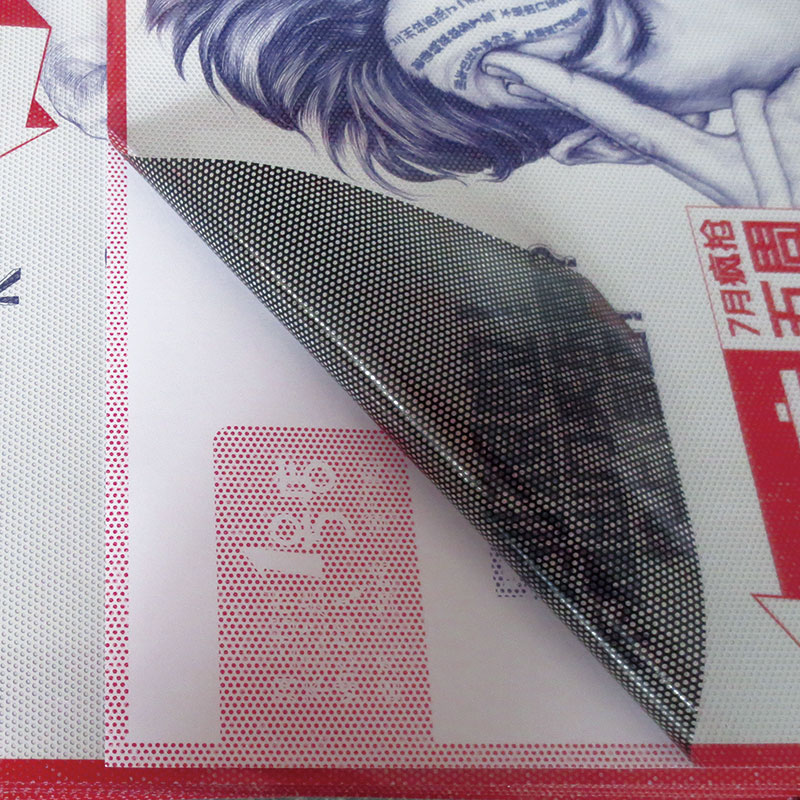 單孔透表面分布了很多圓孔,適合于粘貼在玻璃上,具半透明效果,適用于商場玻璃幕墻以及巴士玻璃窗,防水防曬。