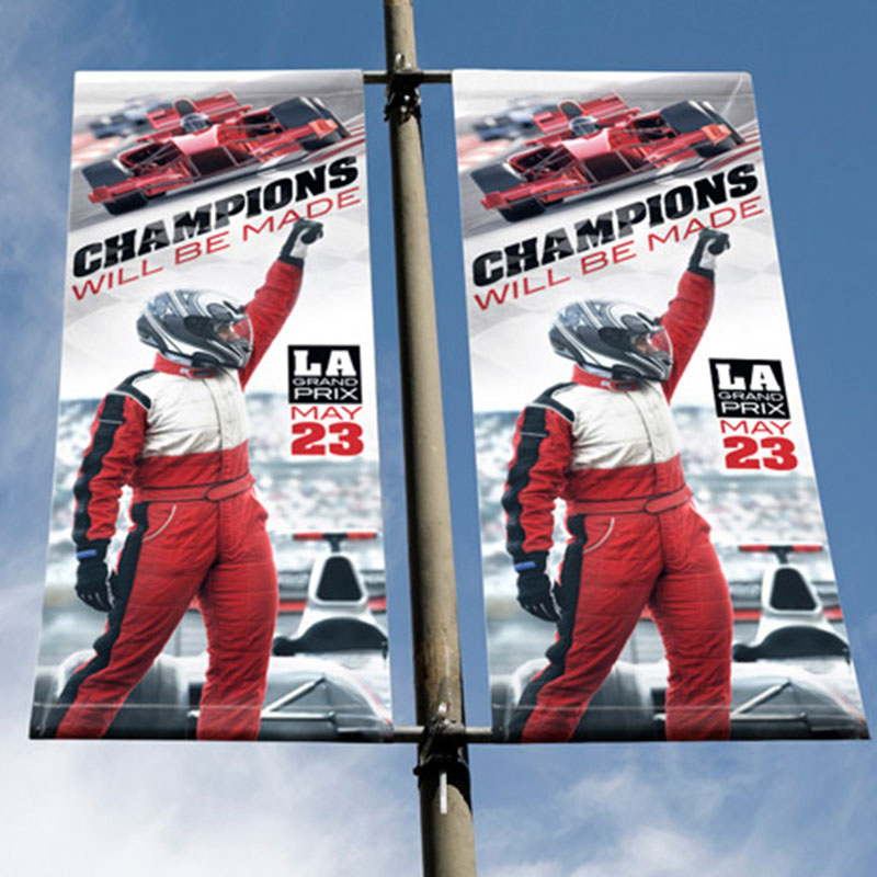 雙面吊旗噴繪,可以兩面噴繪,廣告效果好,畫面不卷邊,平整。是商場中庭吊旗應用的經典案例。也廣泛用于銀行、賓館、寫字樓的窗簾,以及燈桿旗,既能做廣告,又能遮光。